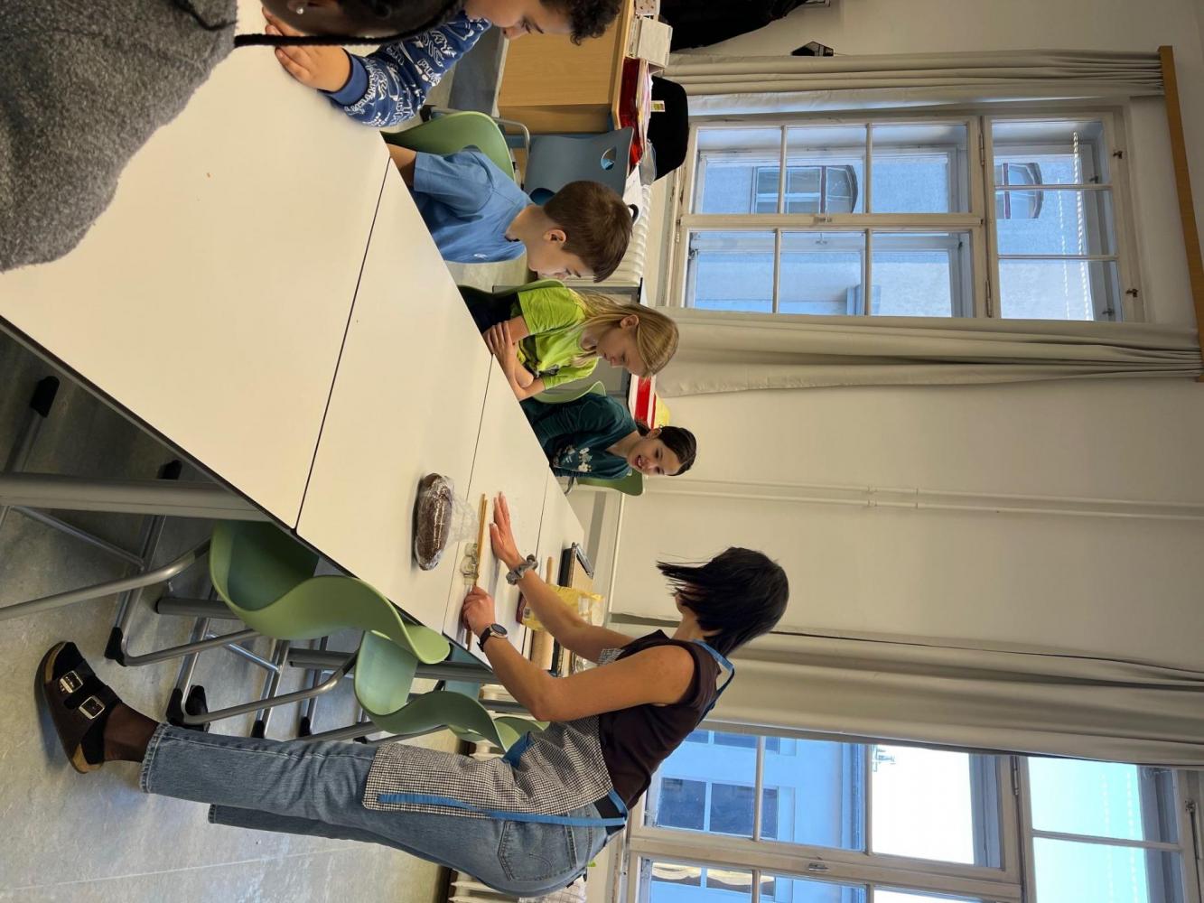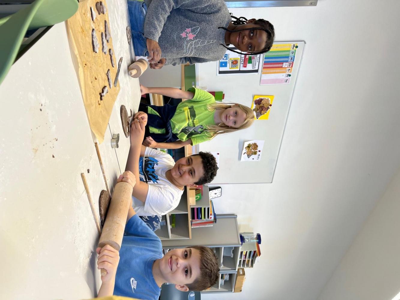 Frau Sattler erklärte den Kindern, wie ein Lebkuchenteig zubereitet wird. Anschließend wurde gemeinsam der Teig ausgerollt, ausgestochen gebacken und verziert. Was für ein Spaß!